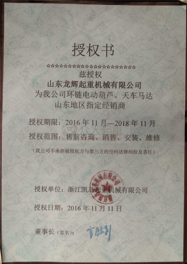 凱島環鏈電動葫蘆授權書