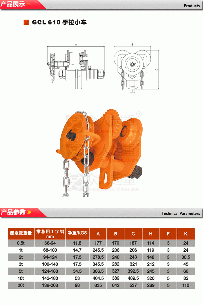 GCL/GCT810系列小車選用了全新的高強度低合金結構鋼,確保4倍安全載荷,輕巧、安全、安裝方便、是目前最為輕巧小車之一。
